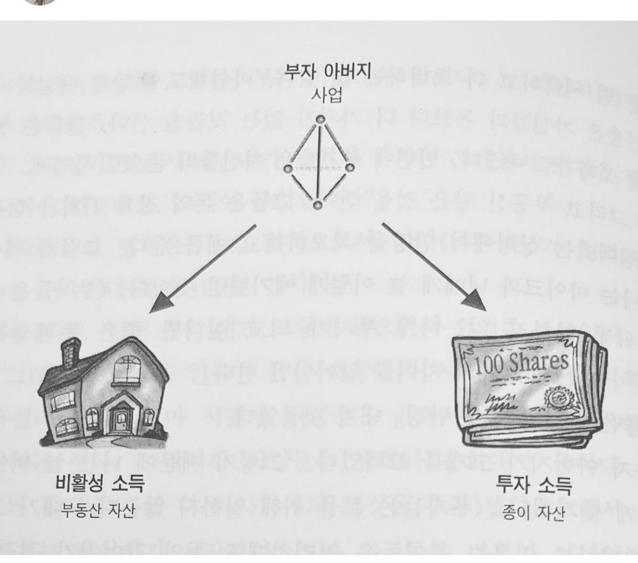 자신의 사업에서 나온 수익을 통해 부동산 자산(비활성 소득)과 종이 자산(투자 소득, 주식 등)을 꾸준히 늘려갑니다.